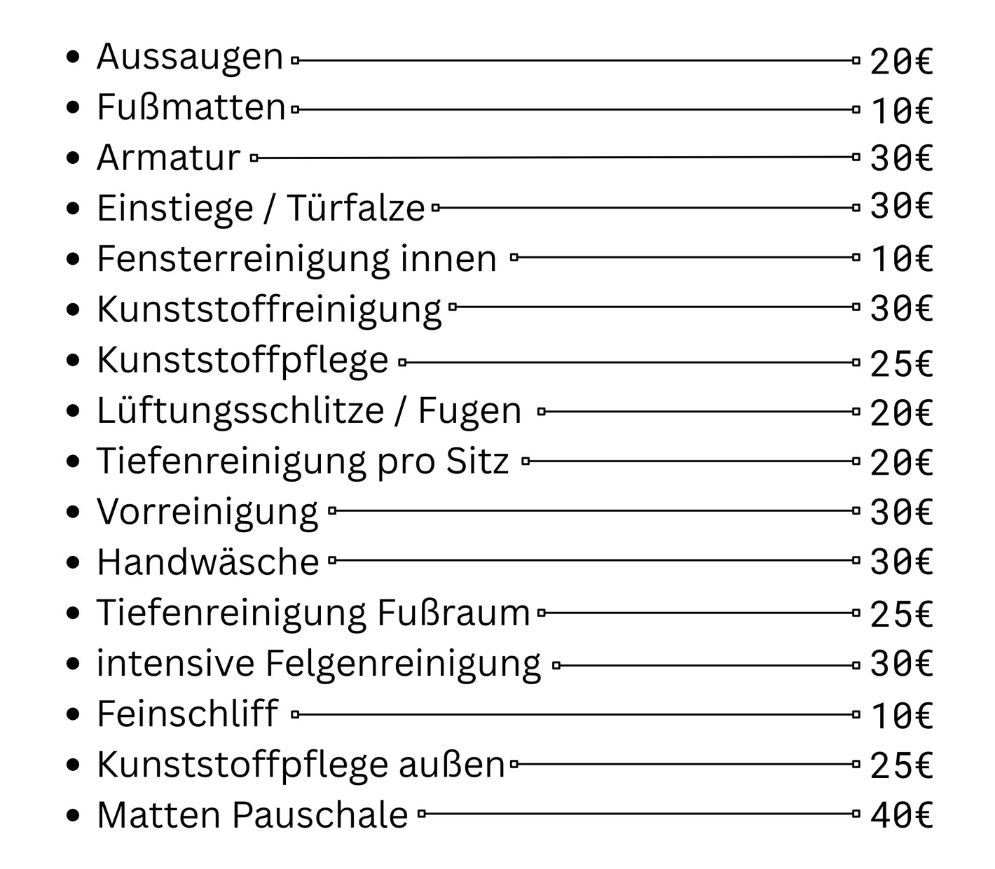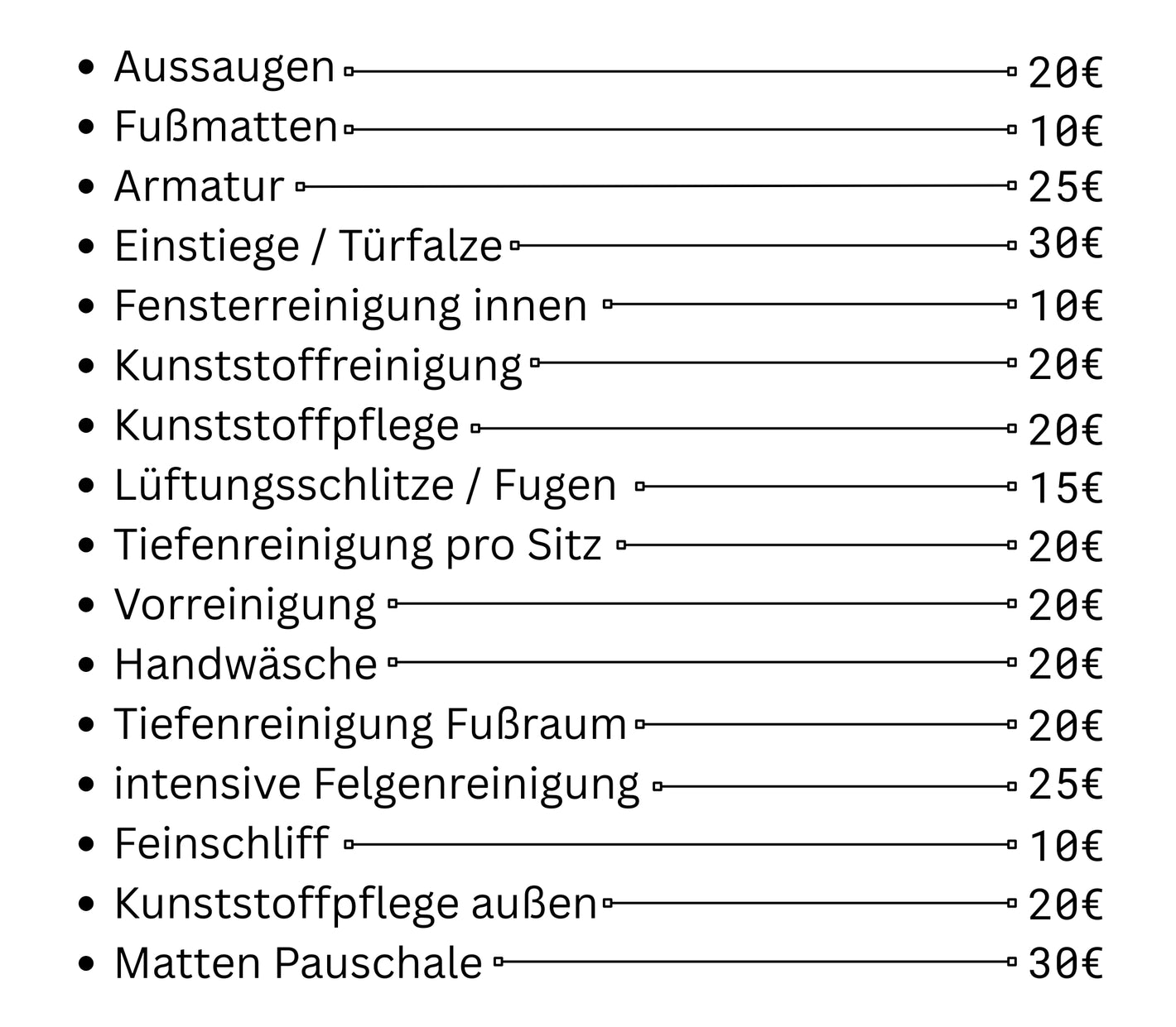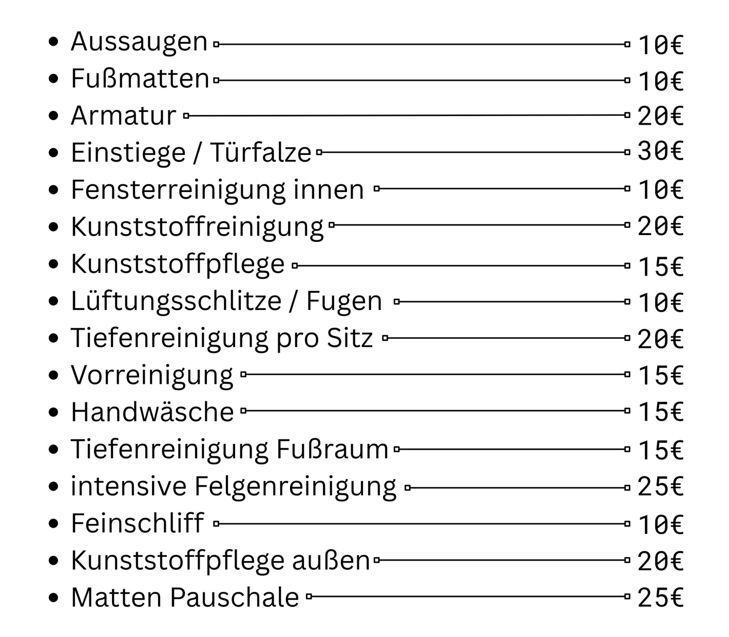 Aussaugen, Fußmatten, Armatur, Einstiege / Türfalze reinigen, Kunststoffreinigung, Tiefenreinigung Fußraum, Tiefenreinigung der Sitze, Lüftungsschlitze und Fugen reinigen, Kunststoffpflege innen, Vorreinigung, Handwäsche, Fensterreingigung, intensive Felgenreinigung, Kunststoffpflege außen, Feinschliff